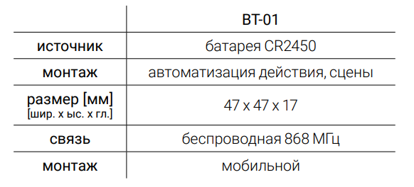 Беспроводная кнопка BT-01 может использоваться, например, для отключения всех осветительных приборов в доме, когда вы выходите из него, или когда вы ложитесь спать.. Любая комбинация количества нажатий позволяет запрограммировать вызов конкретной автоматизации или сцены. Он может использоваться для включения или выключения света, управления работой рулонных штор или любого устройства или группы устройств, подключенных в системе Sinum. Кнопка BT-01 это беспроводное устройство, поэтому вы можете использовать его в любом месте вашего дома.