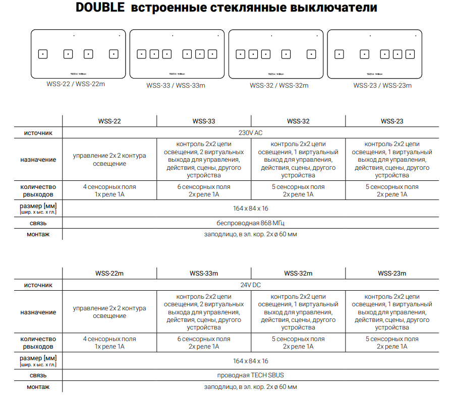 Сенсорные выключатели оснащены сенсорными полями. Они позволяют управлять работой освещения или рулонных штор с помощью встроенных 2 выходов напряжения. Остальные поля являются виртуальными полями для управления сценами, действиями или другими устройствами. Комнатные регуляторы оснащены возможностью подключить датчик температуры пола и контролировать как температуру в комнате, так и поддерживать температуру пола на заданном уровне. Вы также можете защитить его от перегрева. Устройства также оснащены встроенной функцией измерения влажности воздуха. Переключатель имеет встроенный светодиод, который сообщает о состоянии устройства (вкл / выкл). Вы можете изменить цвет подсветки и яркость из приложения Sinum. Связь происходит через главный контроллер Sinum EH-01 беспроводным способом (WSS-*) или проводным способом через TECH SBUS (WSS-*m). Устройства доступны в белом или черном цвете.